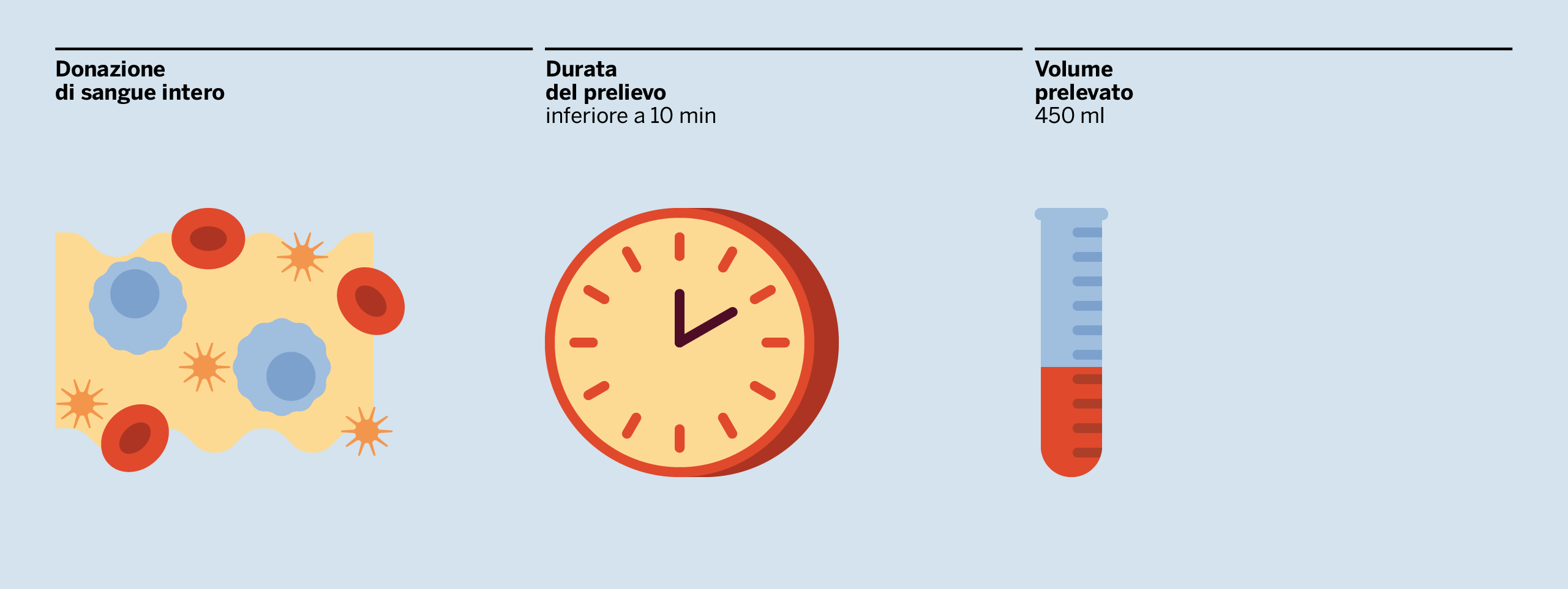 Il volume di sangue prelevato, stabilito per legge, è uguale a 450 ml.